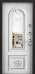 Квартирная дверь Сандал с зеркальной панелью и отделкой белое дерево №11