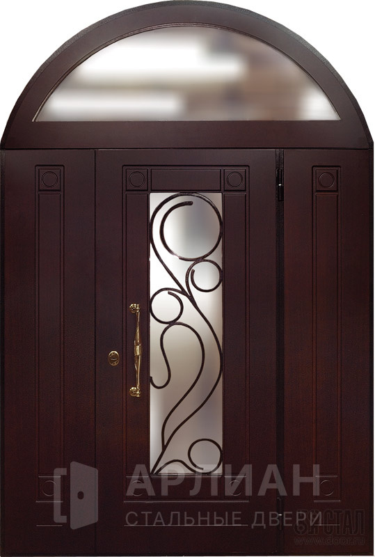 Кованая арочная входная дверь со стеклом и ковкой №69